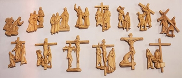 Complete Stations of the Cross, in cast polyester in wood color finish.