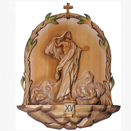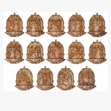 Baroque Style. Intricately hand carved Stations of the Cross include fine details in each relief and are finished by hand using warm, soft shades of tinting. The hand carved olive branch design and rock path frame each station beautifully and reflect the baroque style. Each station has a rugged wooden cross and Roman numeral. Since each piece is hand carved and finished there will be slight artistic variations in each set created. Carved in olive wood.