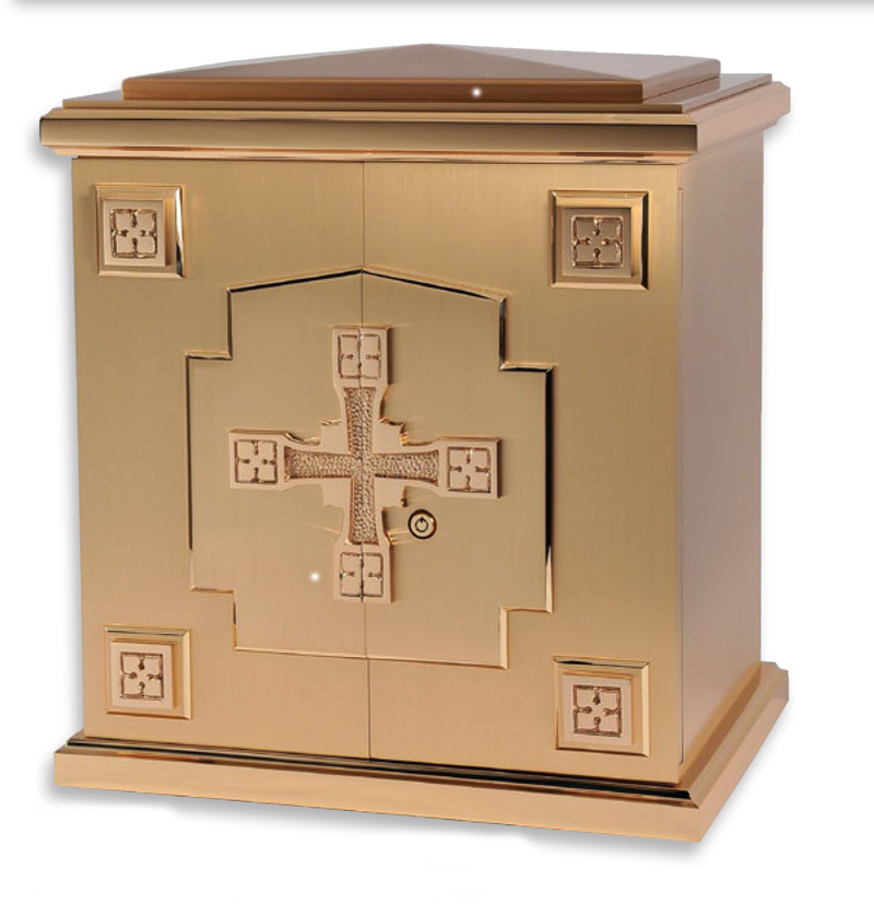 This tabernacle is made of bronze. It has a bas relief sculpted decoration of satin and high polish finish.