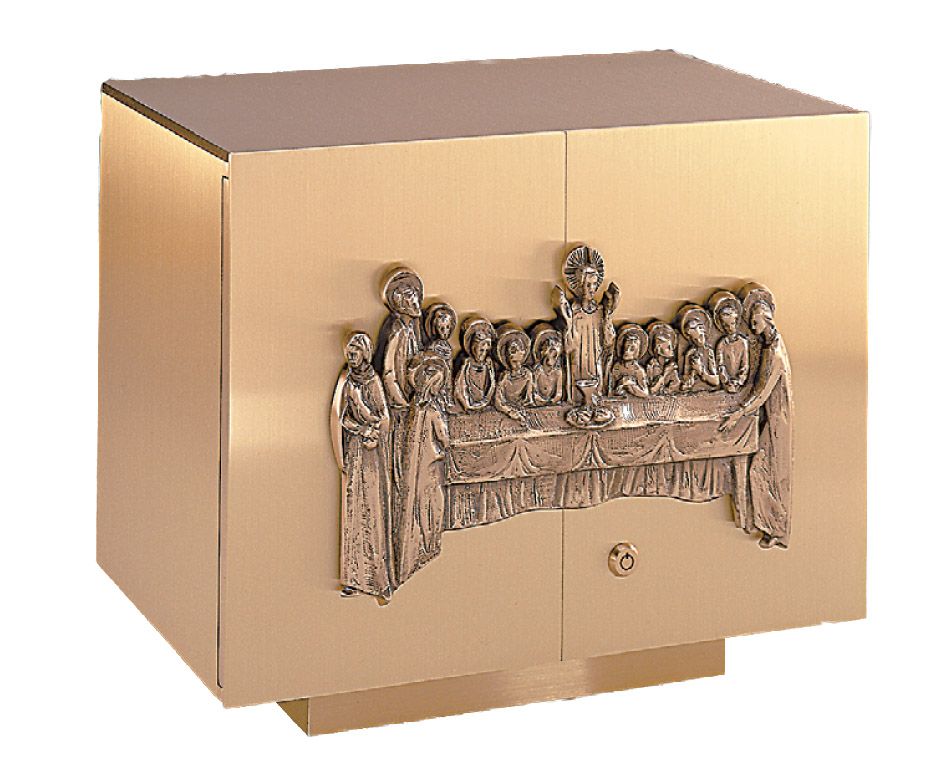 This tabernacle is made of satin bronze. Applied cast bronze. Bas relief of genuine statuary bronze finish.
