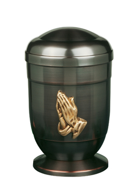 Beautiful Copper Urn with steel gray color and brass praying hands accent.