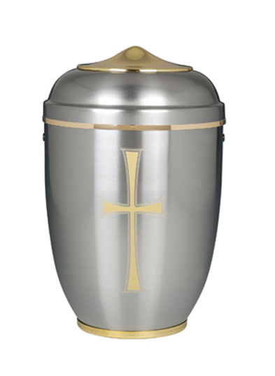 Beautiful aluminum urn with gold accents on top/lip of cover and cross.