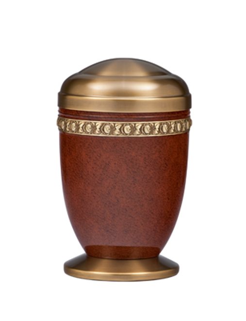 Gorgeous aluminum and brass urn with reddish/brown marble effect and gold top.