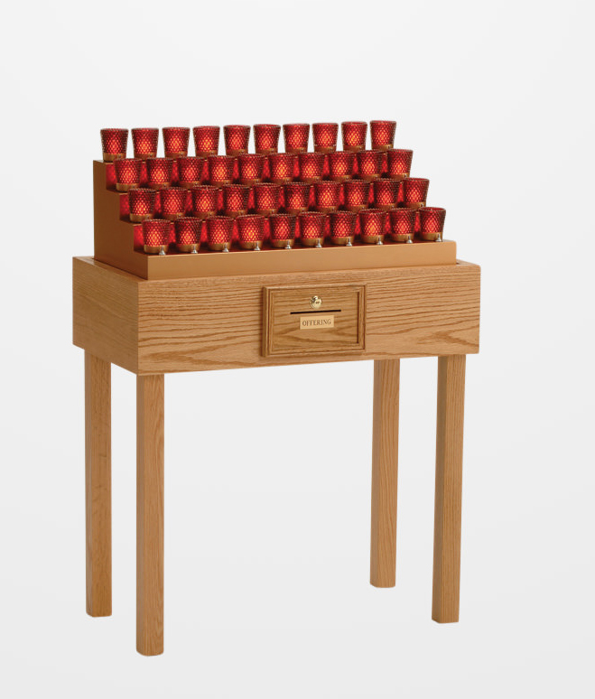 Votive stand is made in the USA and measures 39″H x 31″W x 16″D.