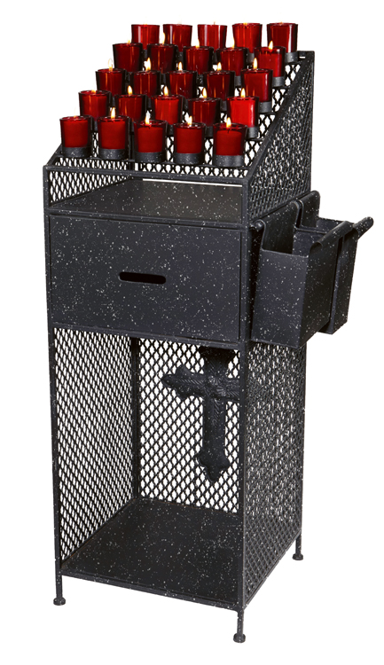 Custom designed wrought iron votive stands is black powder-coated with white speckled highlights. It is carefully crafted from all metal components with built-in features for easy use and care. Comes with locking back access to offering box and includes hanging sand and lighting box. This stand is made for votive candles and is 14″w x 38″h x 13-1/2″d. It holds up to 25 candlesthat are 2-1/8″ diameter. We recommend the glass votive holders VC712, VC713, VC714 or VC715 sold separately. Candles are also sold separately. Additional freight charges will apply.
