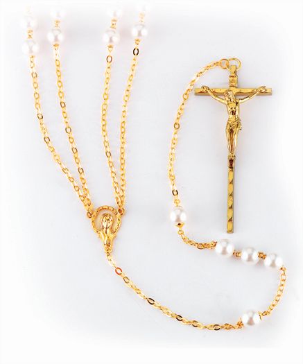 Imitation Pearl Lasso Wedding Rosary with Gold Plated Chain, Crucifix and Center, 8 mm.